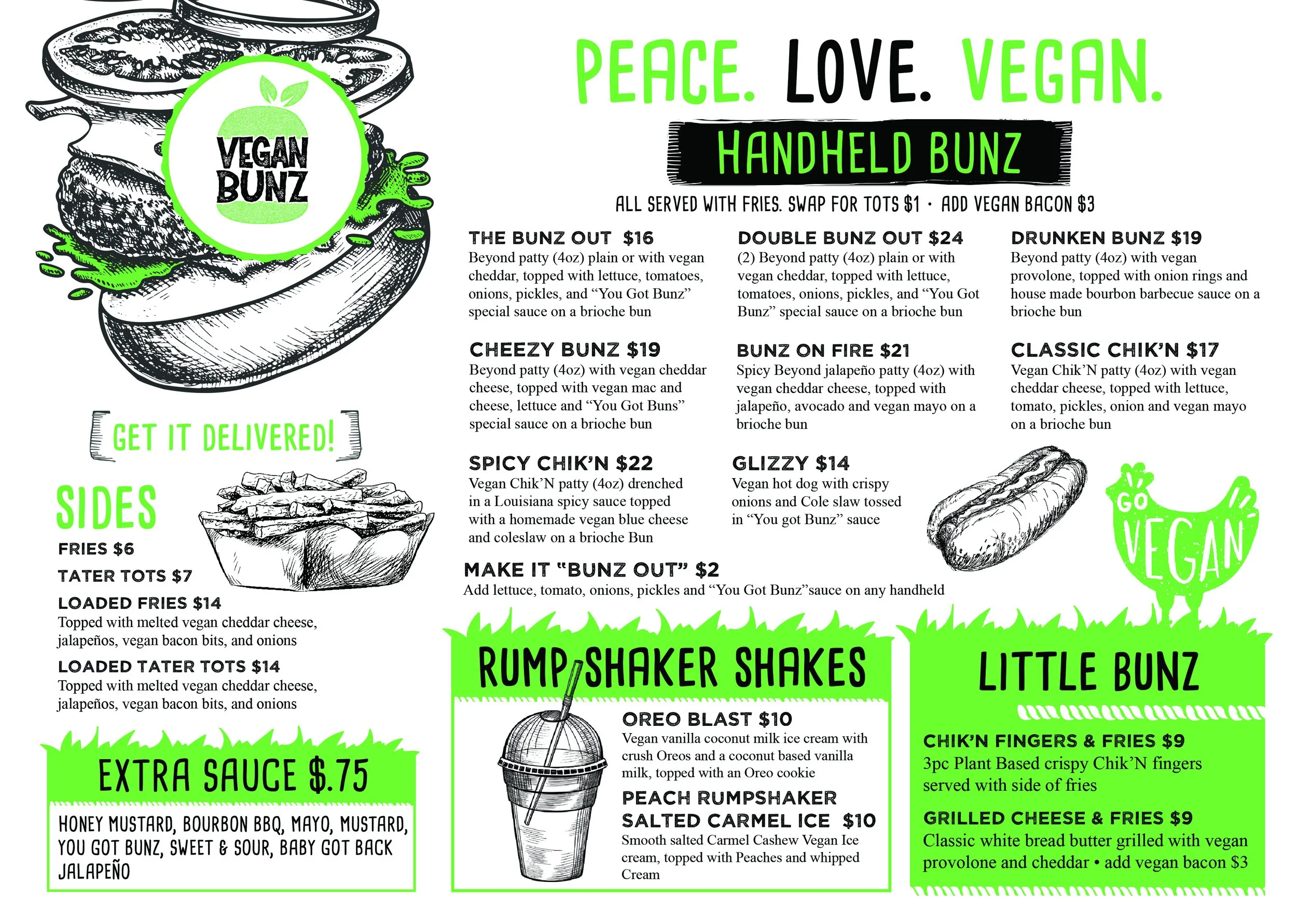 Vegan Bunz serves all of America’s favorite fast food items with that same comforting feeling we all know & love - just without the animals! We use high quality vegan ingredients so that you can’t even tell it’s not real meat!
